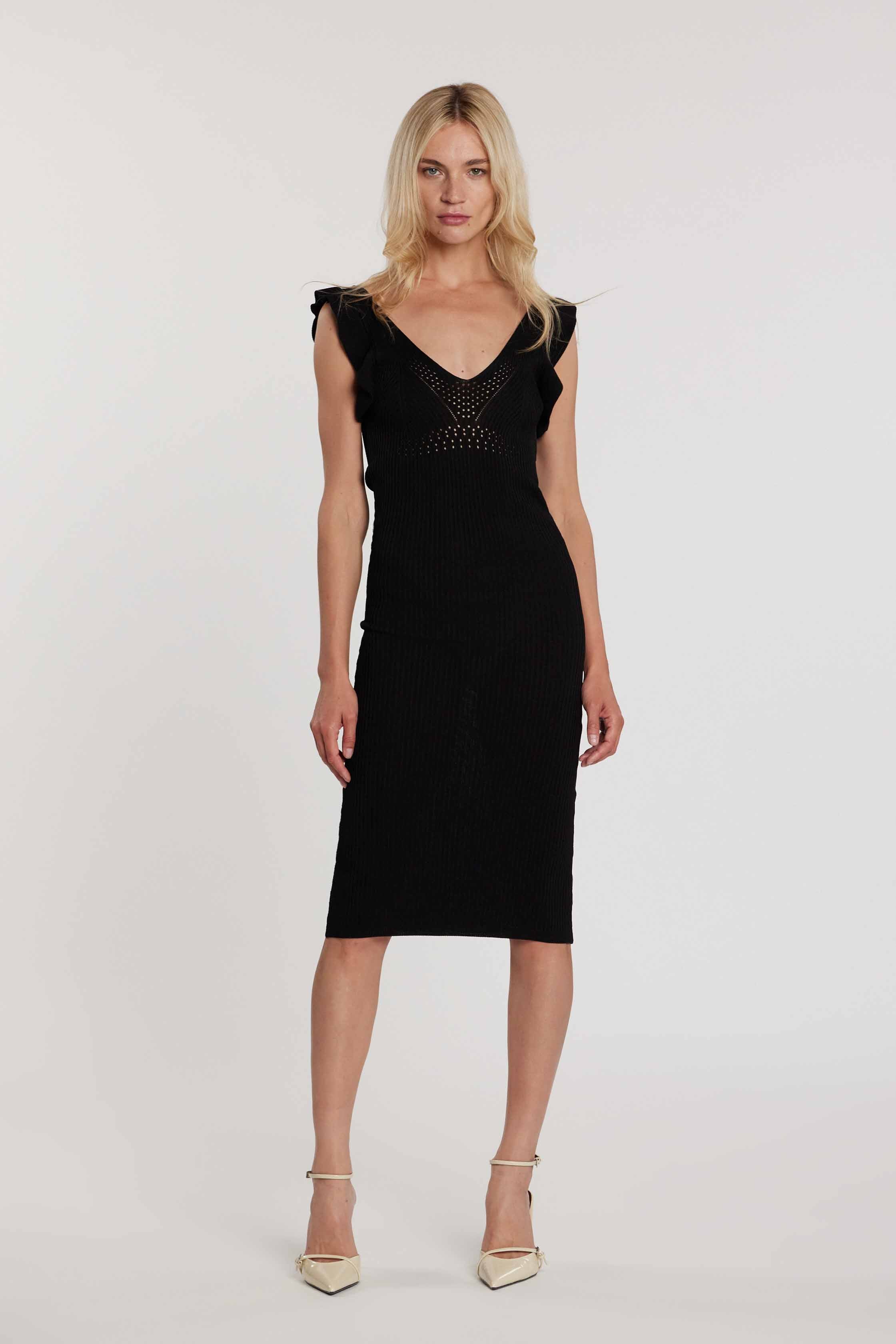Abito CLAIR midi smanicato con rouches doppio scollo a V costina