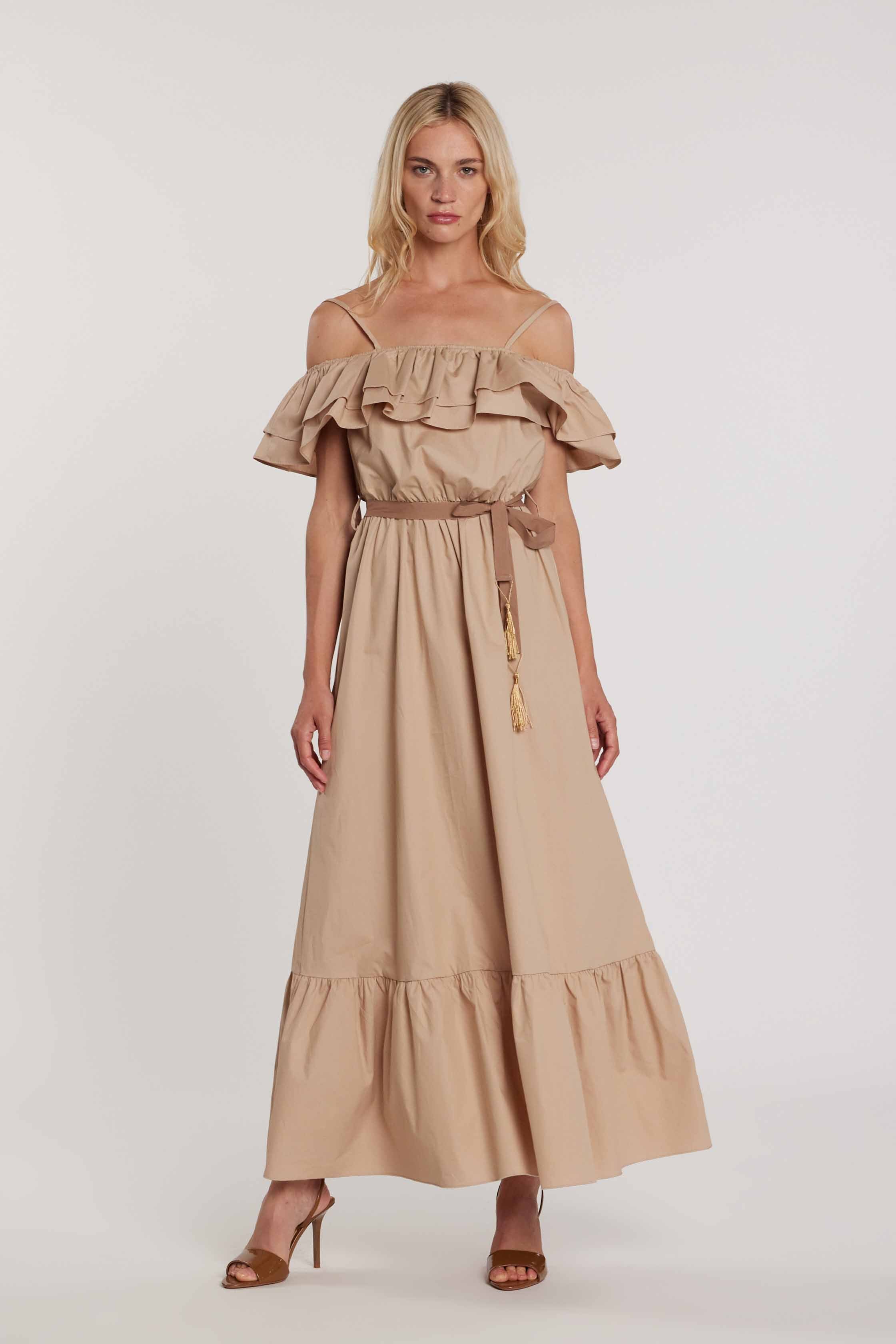 Abito MOLIER lungo maniche lunghe scollo barca più bretelle con balze più cintura con nappe