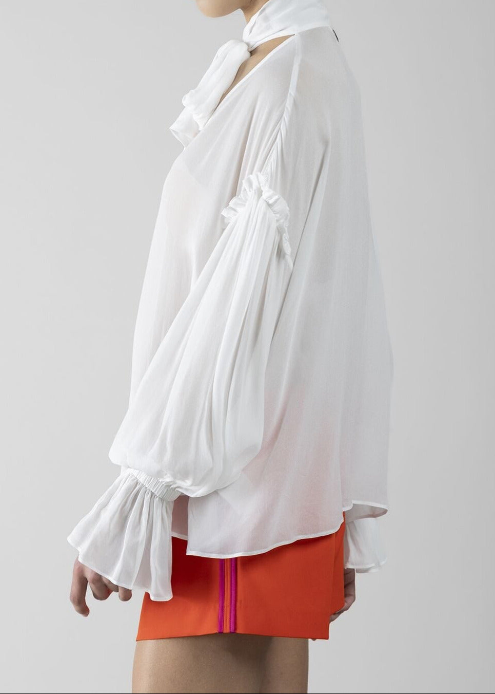 BLUSA "NINFEA" A MANICA LUNGA IN GEORGETTE CON SCOLLO A V E NASTRINO ANNODABILE, DETTAGLIO LOGO DR.