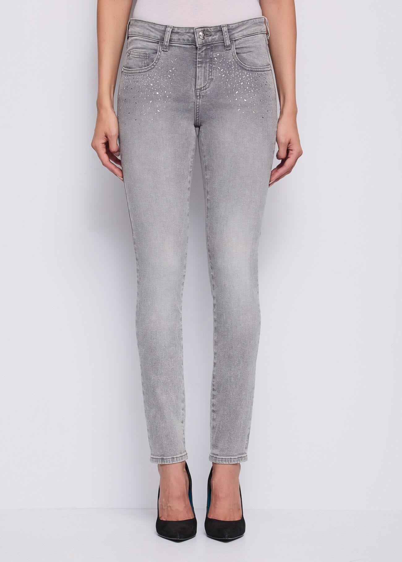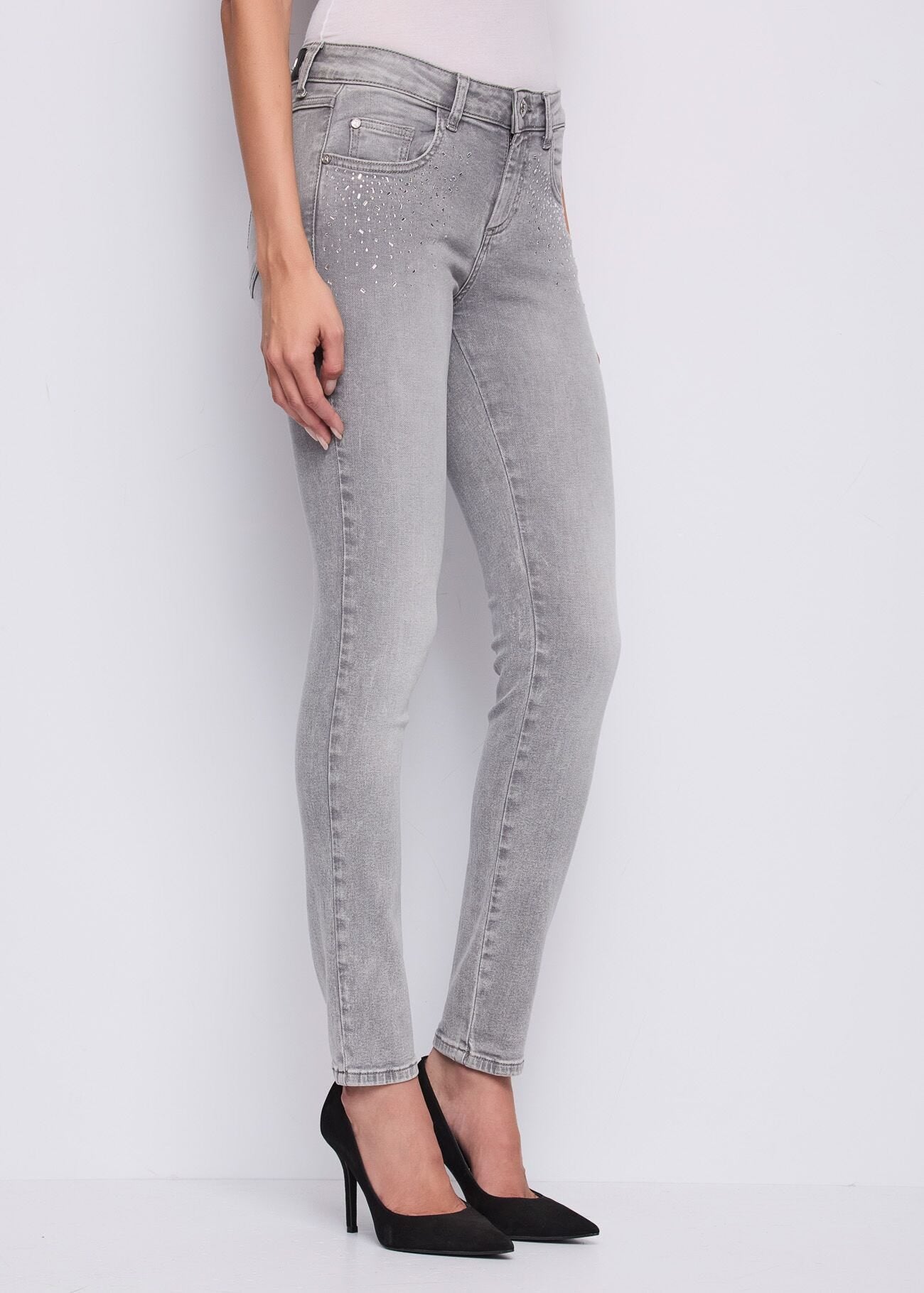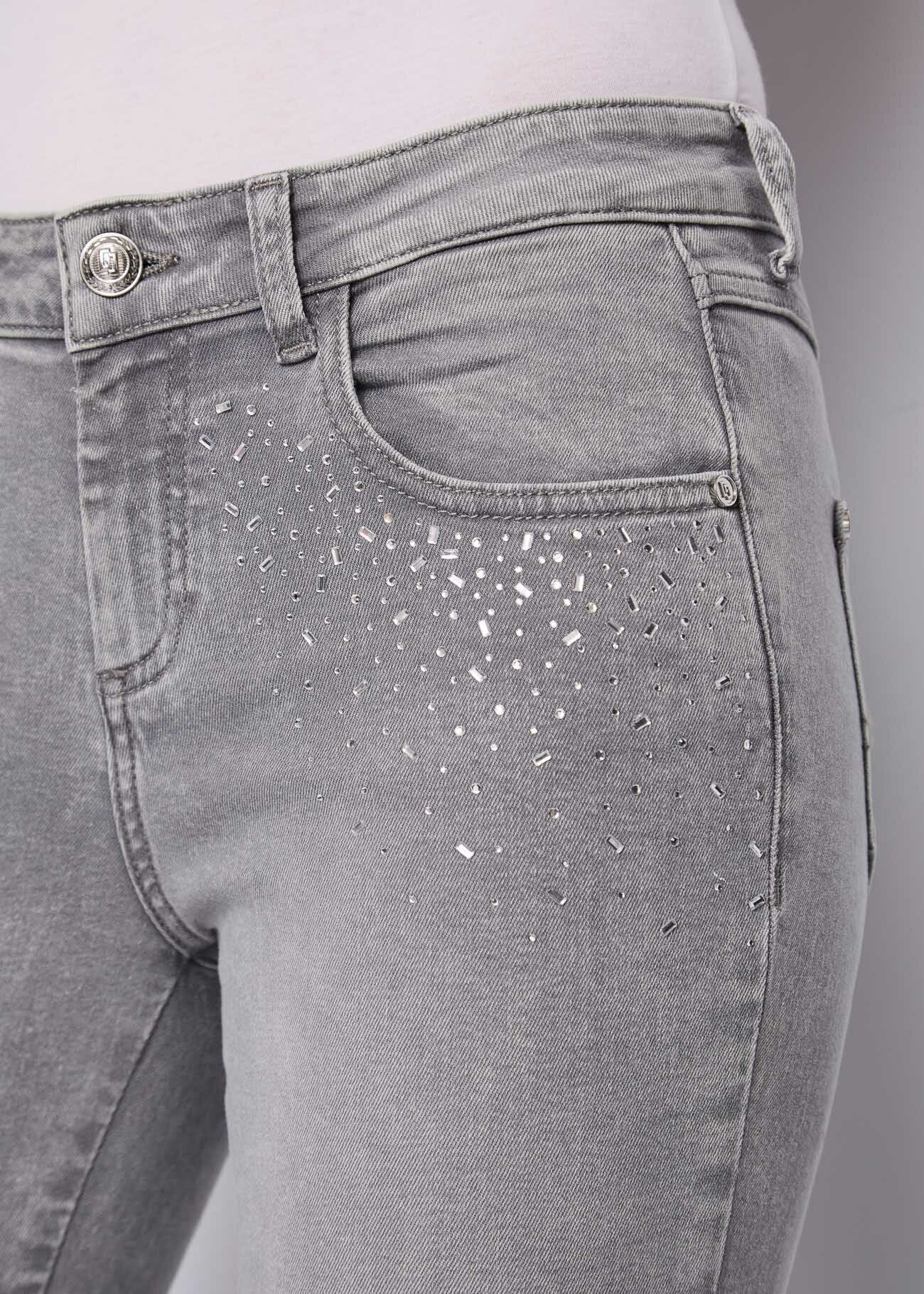 Scegli i jeans skinny in cotone elasticizzato effetto used con strass e salpa logata. Fit avvolgente per...