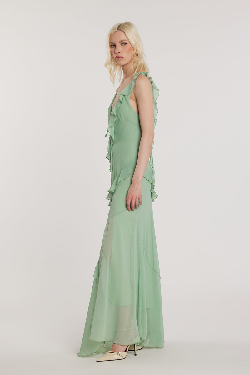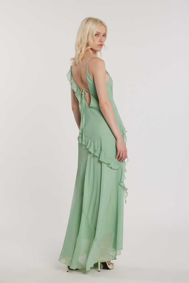 Abito CARAH lungo smanicato doppio scollo V con rouches più stringhe più spacco