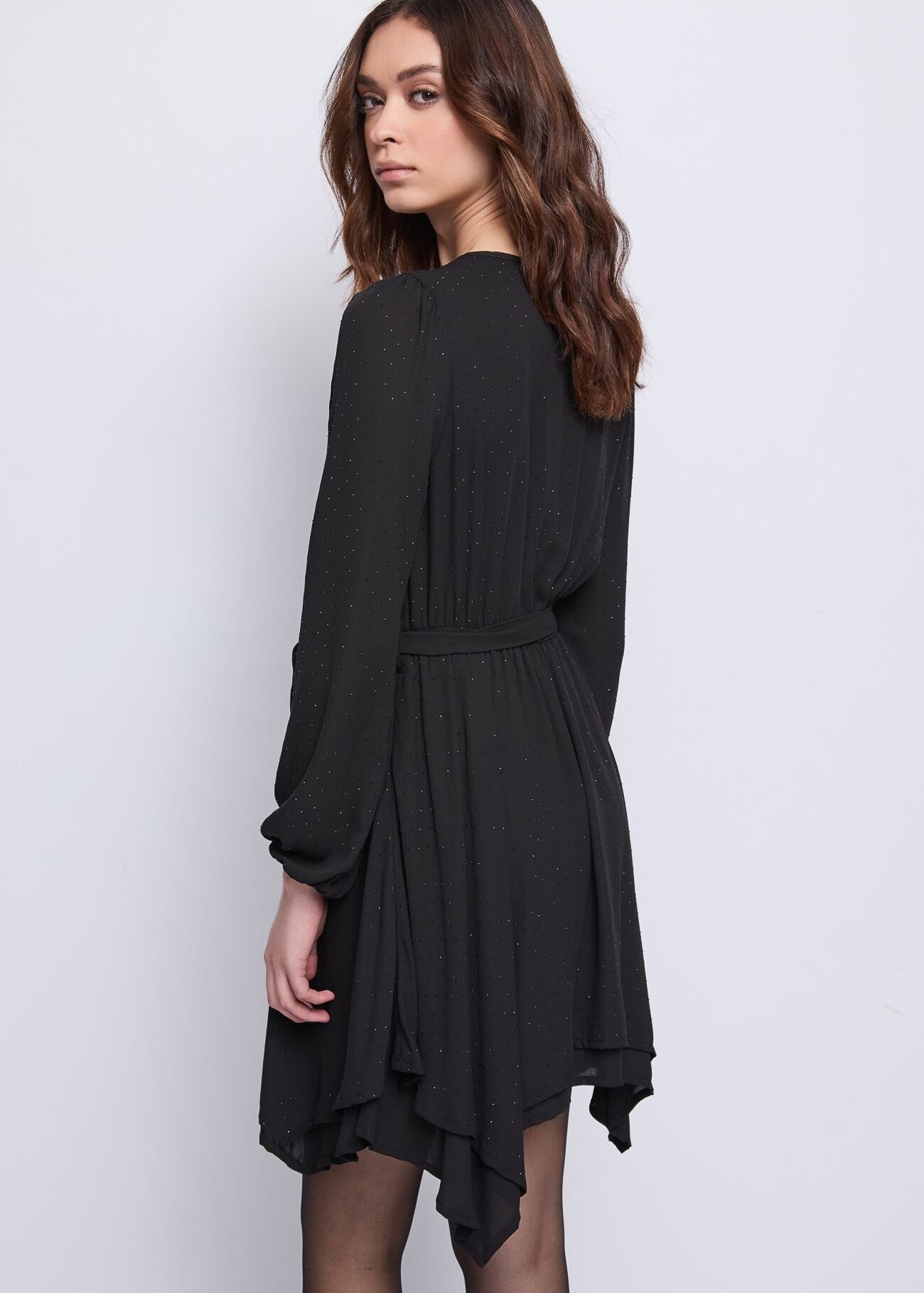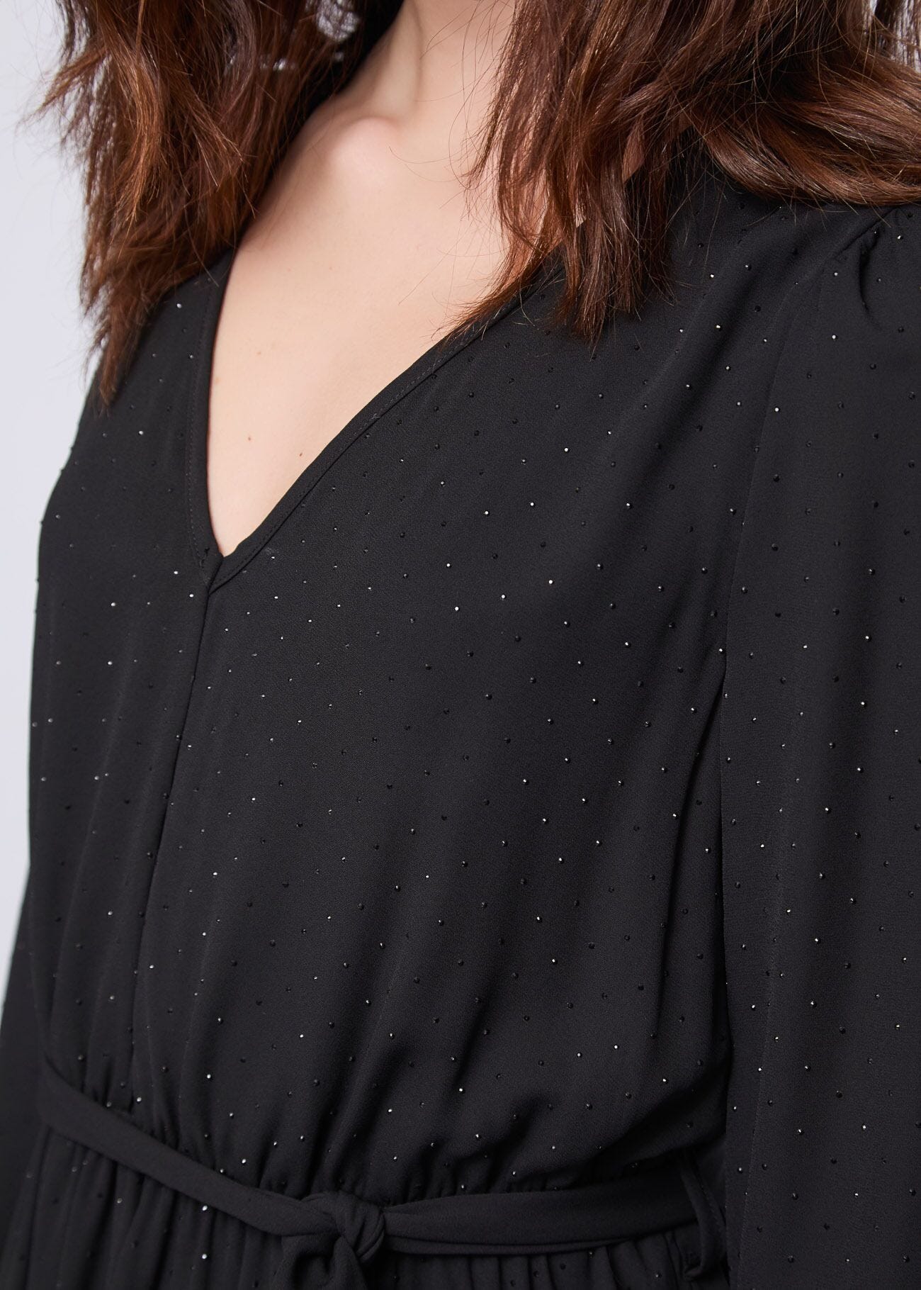 Scegli l'abito in georgette con strass all over, scollo a V e cintura coordinata. Per un’eleganza scintillante...