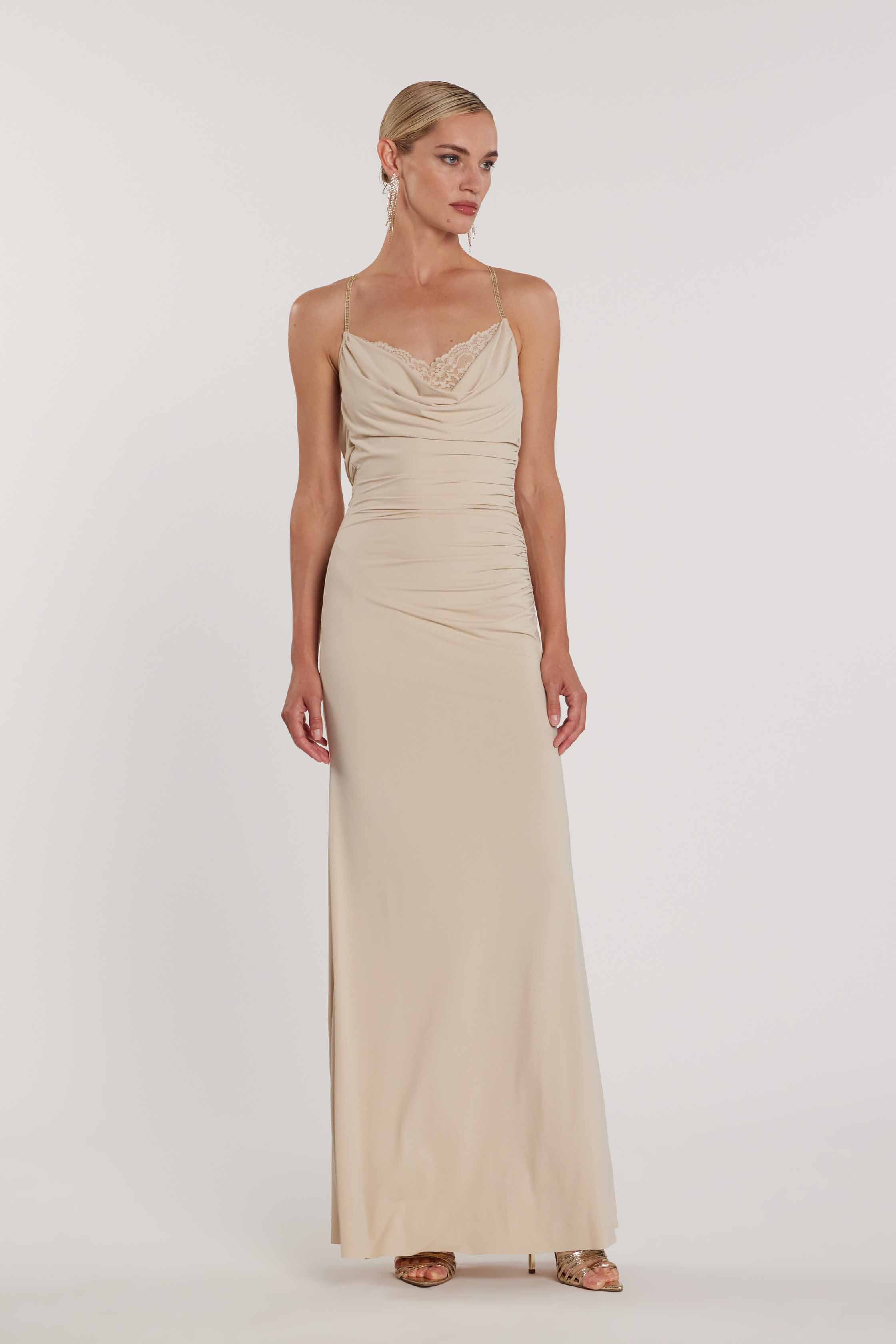 Un abito che celebra la femminilità con linee moderne e dettagli ricercati. Perfetto per occasioni speciali e quotidiane.
