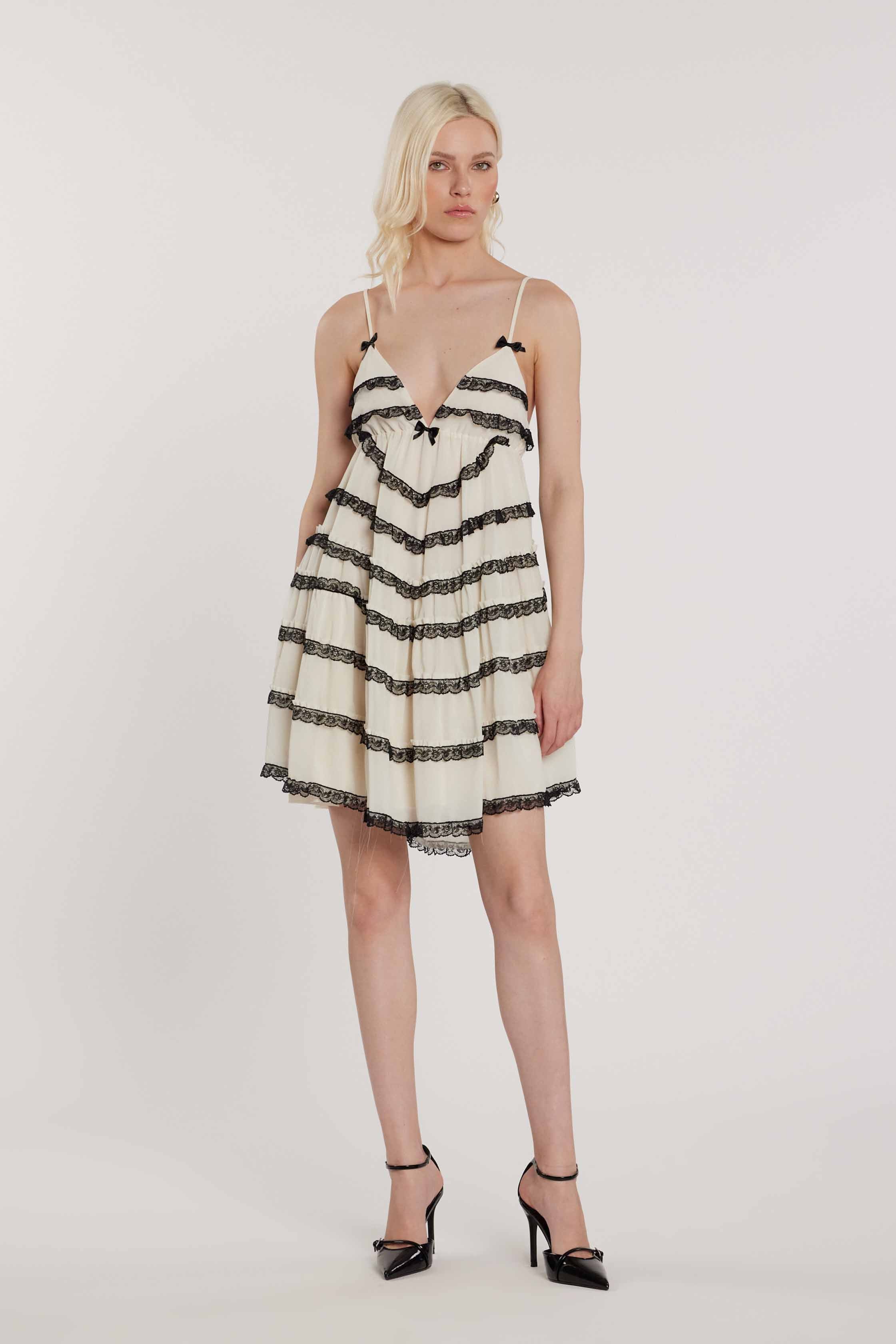 Abito SALMY corto smanicato con rouches pizzo più fiocchetti