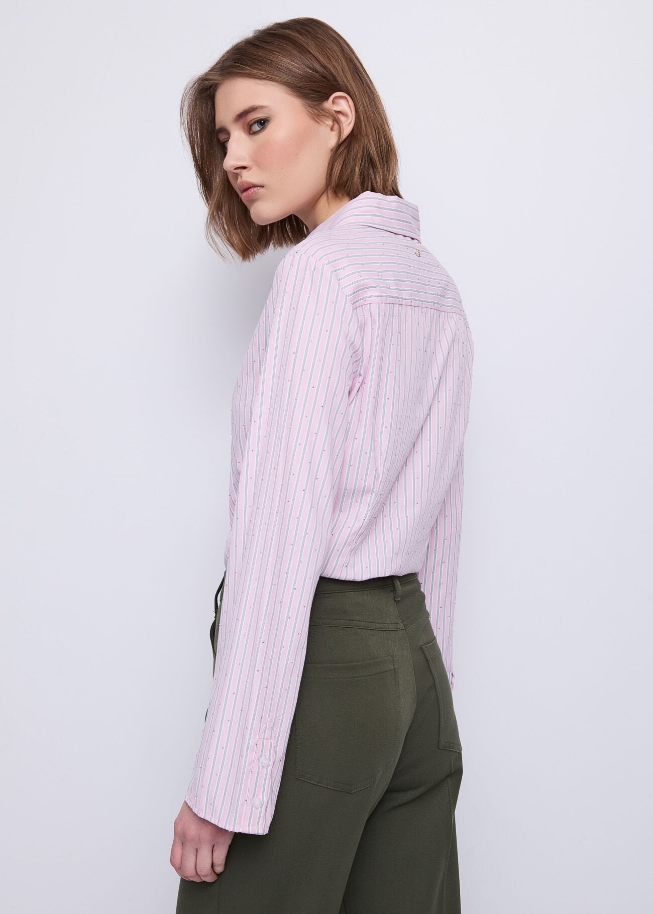 Scegli la camicia in misto cotone a righe con strass all over e maniche lunghe. Taglio classico...