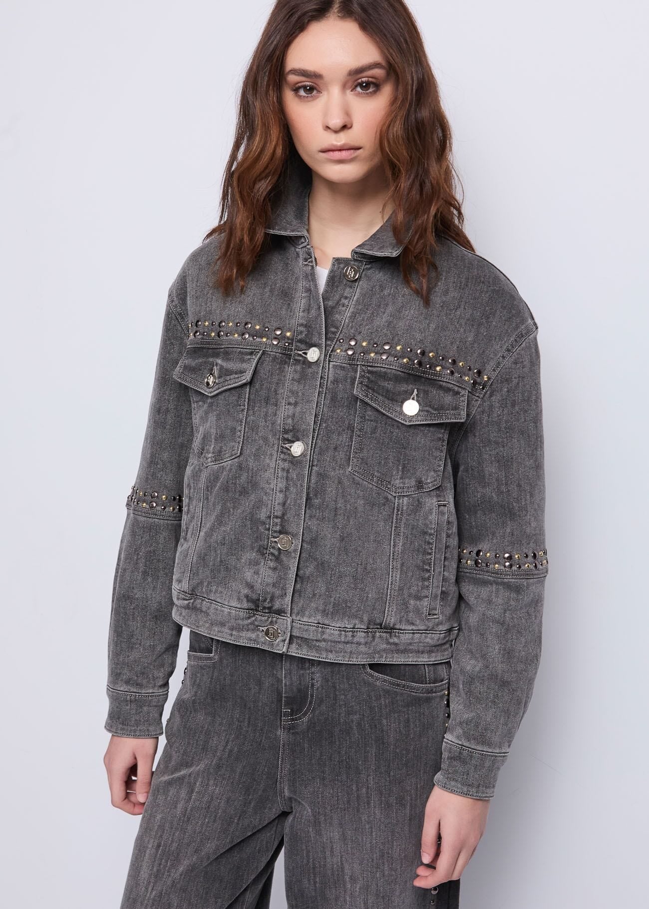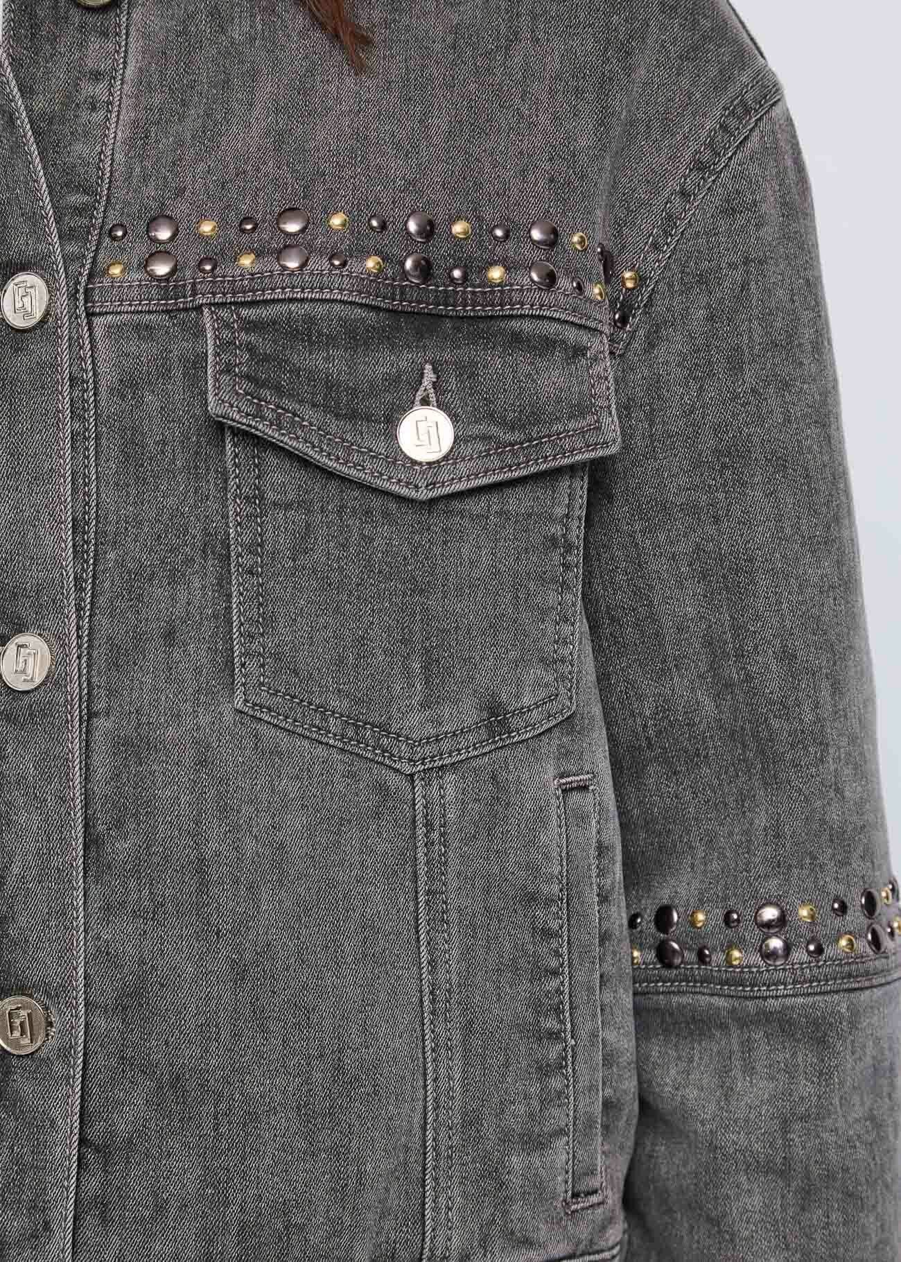 Scegli la giacca in denim di misto cotone used con bottoni logati e borchie in metallo. Un...