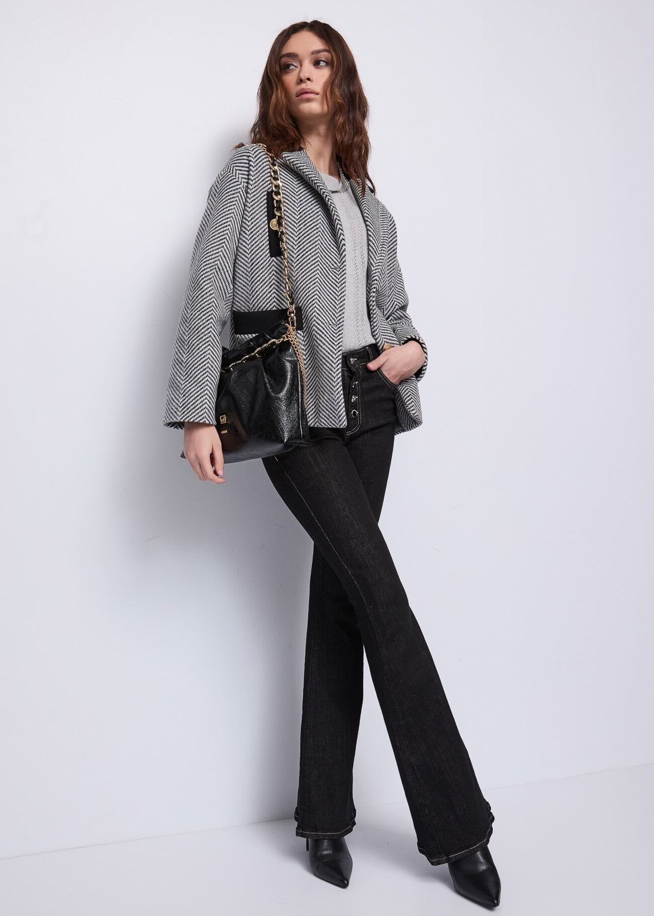 Scegli la giacca in misto viscosa chevron con dettagli a contrasto e bottoni dorati. Perfetta per un...