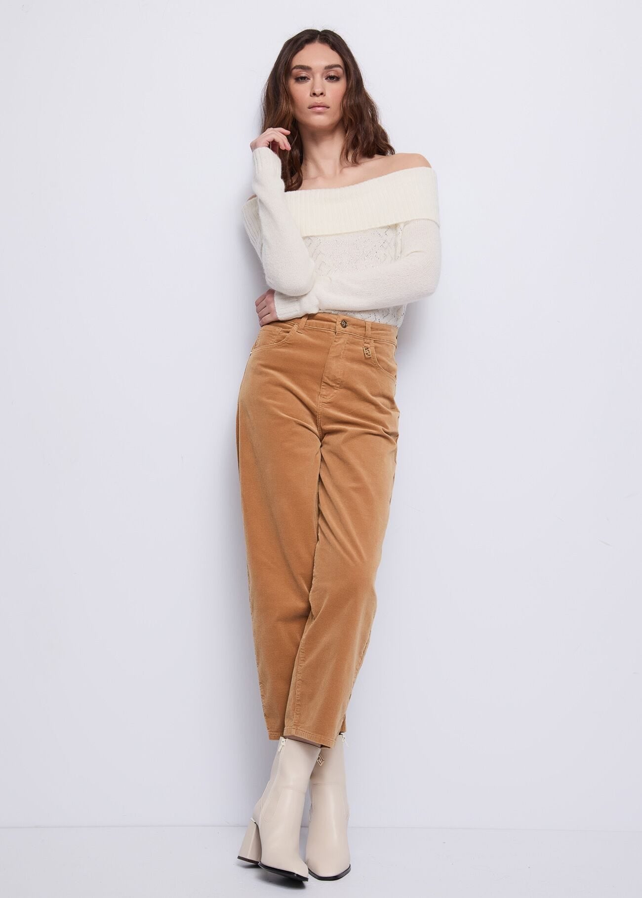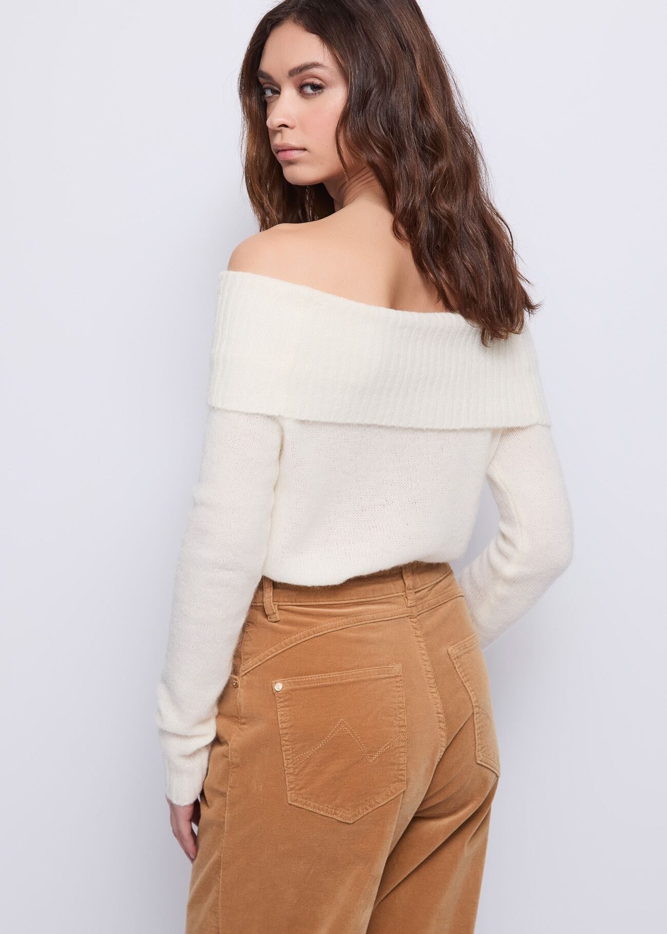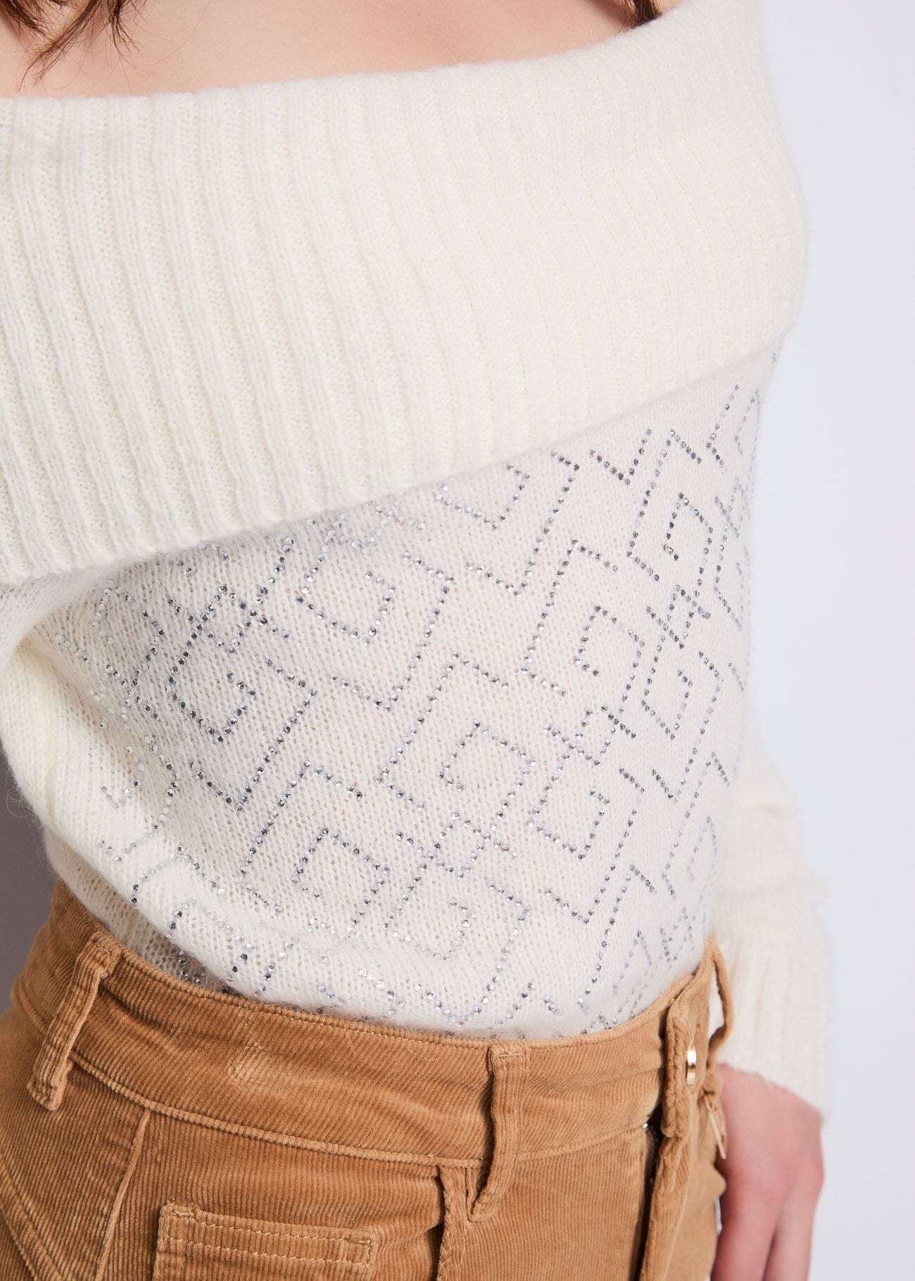 Scegli la maglia off the shoulder in morbido filato di misto lana e mohair con strass. Un...