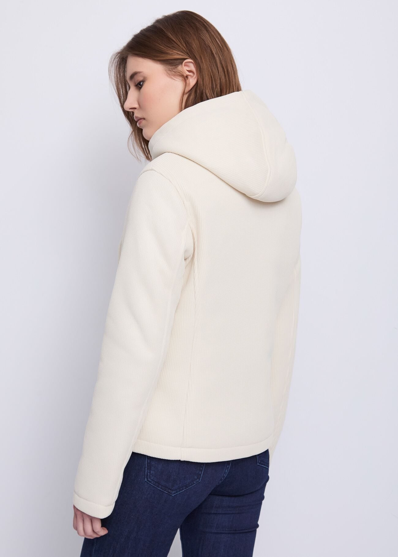 Scegli il piumino corto in tessuto tecnico con cappuccio e tasche con zip. Linee minimal per un...